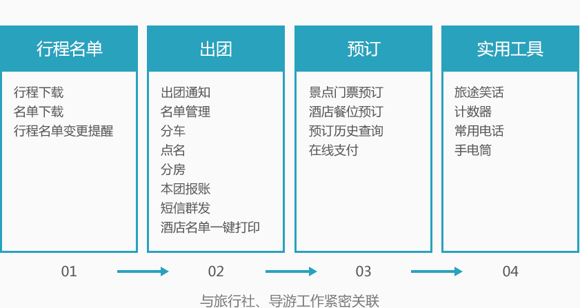 六、 導(dǎo)游手機客戶端:完成接團、行程安排、出團、報賬等必要流程,并提供如點名、分房、分房卡、記賬、計數(shù)等導(dǎo)游實用工具。
