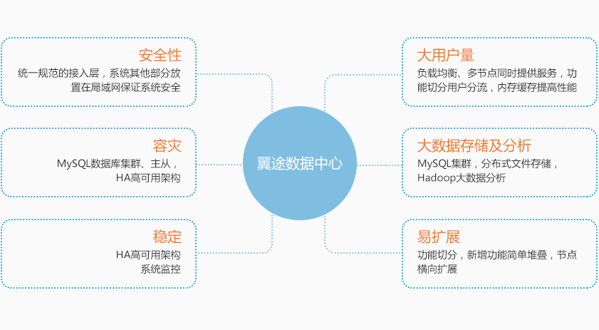 一、 翼途數(shù)據(jù)中心:整個系統(tǒng)的核心業(yè)務(wù)處理、數(shù)據(jù)存儲及分析中心;二、 系統(tǒng)管理平臺:實現(xiàn)對整個系統(tǒng)的數(shù)據(jù)管理、運行監(jiān)控;